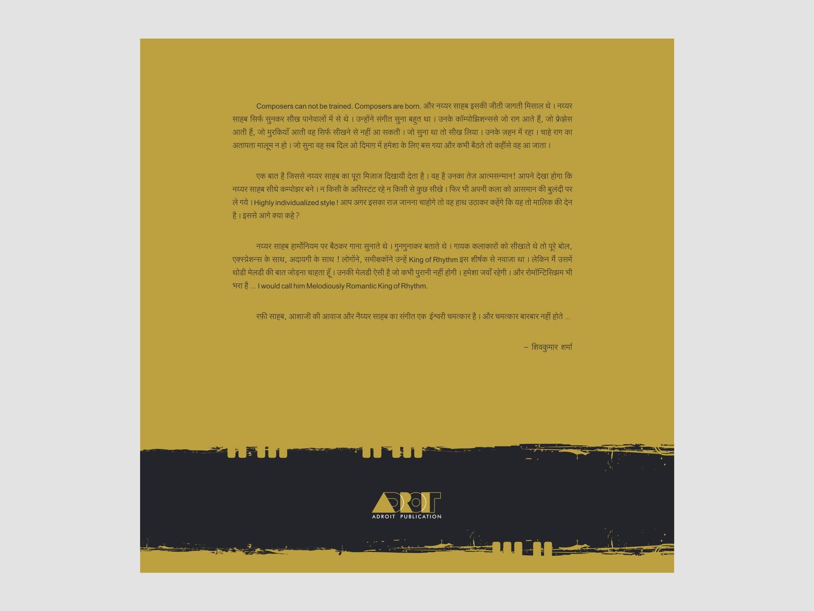 Expressive photographs of melodiously romantic rhythm King O P Nayyar. In this book song appreciation and preface is written by Santoor Maestro Padma Vibhushan Pt. Shivkumar Sharma.